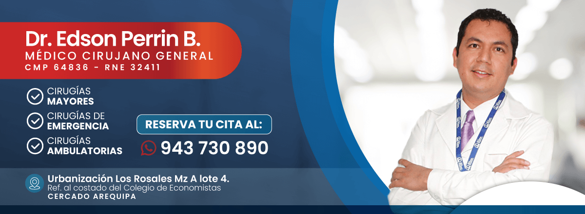 Dr. EDSON JUNIOR PERRIN BERRIOS Médico Cirujano especialista en cirugía general - cirugía de colon, recto y ano, ha realizado estudios en la UNIVERSIDAD NACIONAL DE TRUJILLO (Perú), UNIVERSIDAD DE BUENOS AIRES (Argentina) y SOCIEDAD MEXICANA CIRUJANOS COLON, RECTO Y ANO (México).