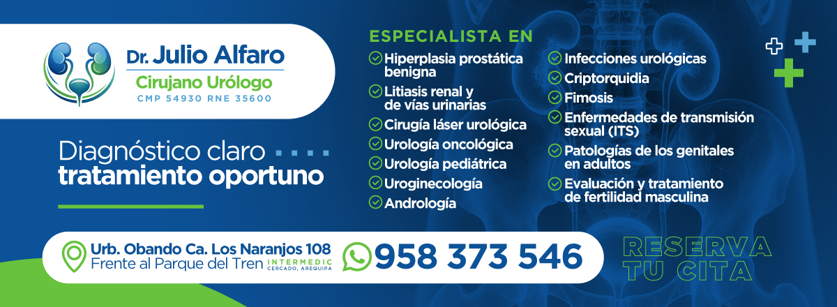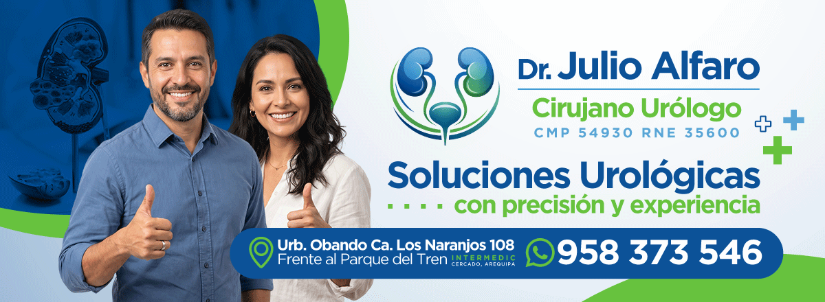 El Dr. Julio Alfaro Aparicio es especialista en urología, enfocado en el diagnóstico y tratamiento integral de enfermedades del sistema urinario y reproductor masculino. Brinda atención especializada en patologías prostáticas, litiasis renal, infecciones urológicas y cirugía láser de próstata y cálculos, utilizando tecnología moderna para lograr resultados seguros y efectivos.